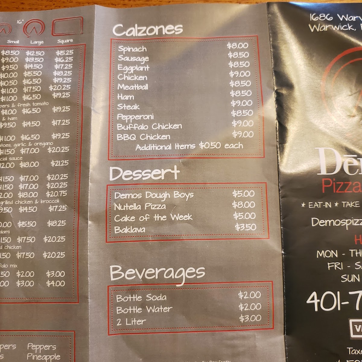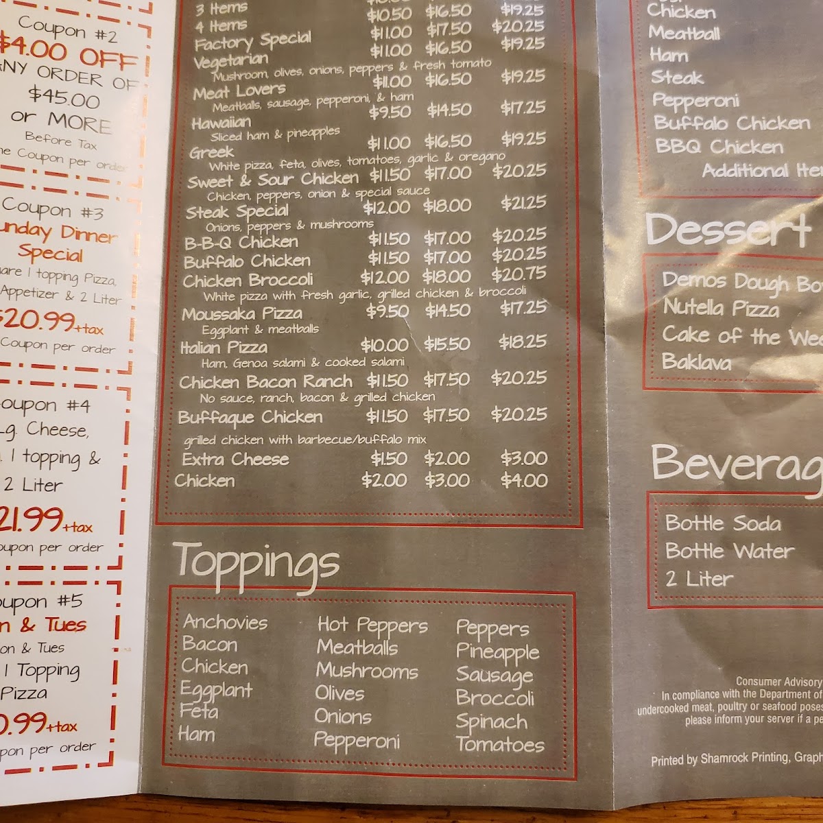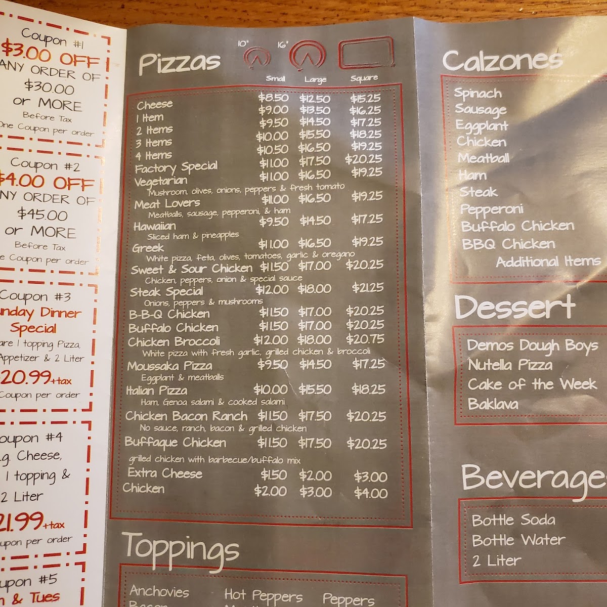 Demo's Pizza Factory offers a menu that blends casual comfort with simple, satisfying meals. Its selection features hearty pizzas, classic Greek dishes, and a variety of wraps and salads, making it easy to find something enjoyable for lunch, dinner, or a relaxed night in. Whether you’re craving a well-done meat lovers pizza or a fresh Greek salad, the menu caters to a range of tastes and appetites.